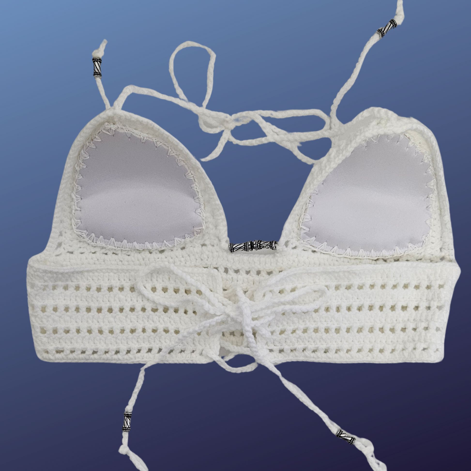 Design: Shell-stitch crochet front cups, crisscross back straps, and a white lace halter neckline.