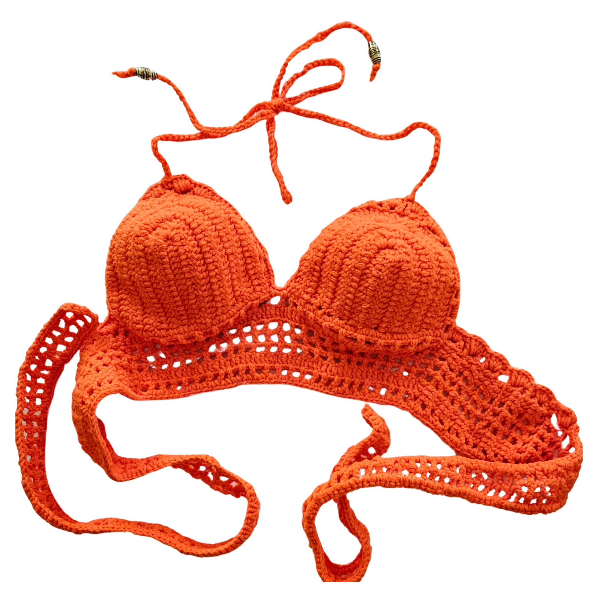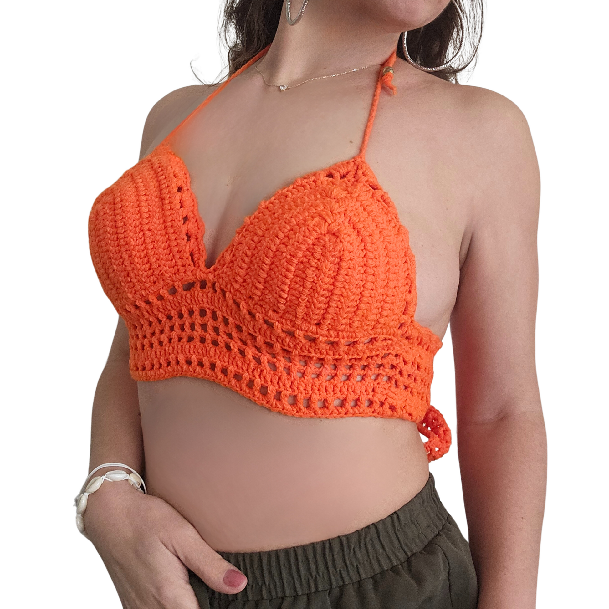Design: Halter neckline with padded cups, shell-stitch crochet detailing, and chic back lace straps.