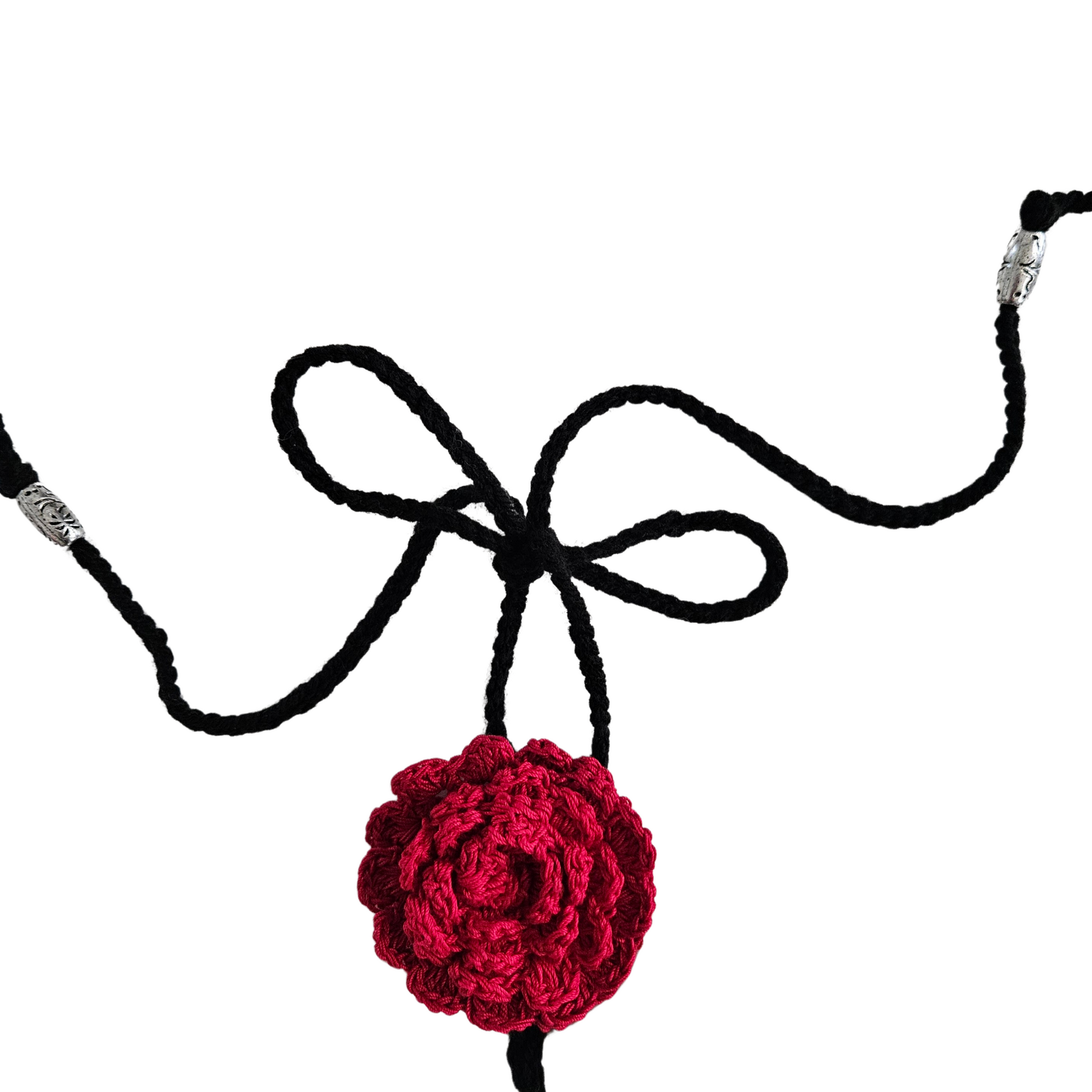 Design: Intricate hand-crocheted pattern with a striking red flower accent.